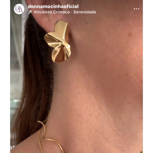 Brinco grande em formato de folha, com design modulado e folheação em ouro 18 quilates, peça orgânica, ideal para um visual sofisticado e moderno inspirado na natureza.