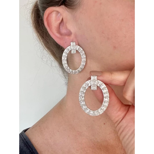 Brinco oval vazado, grande folheado em ródio branco, cravejado com zircônia cristal e design sofisticado. Desenvolvido com tecnologia antialérgica e 1 ano de garantia no banho.