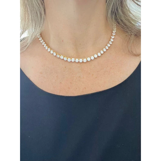 Colar Gargantilha festa luxuosa, com design sofisticado, destaque para zircônia redonda de brilho intenso e banho em ouro 18K, perfeita para ocasiões especiais.